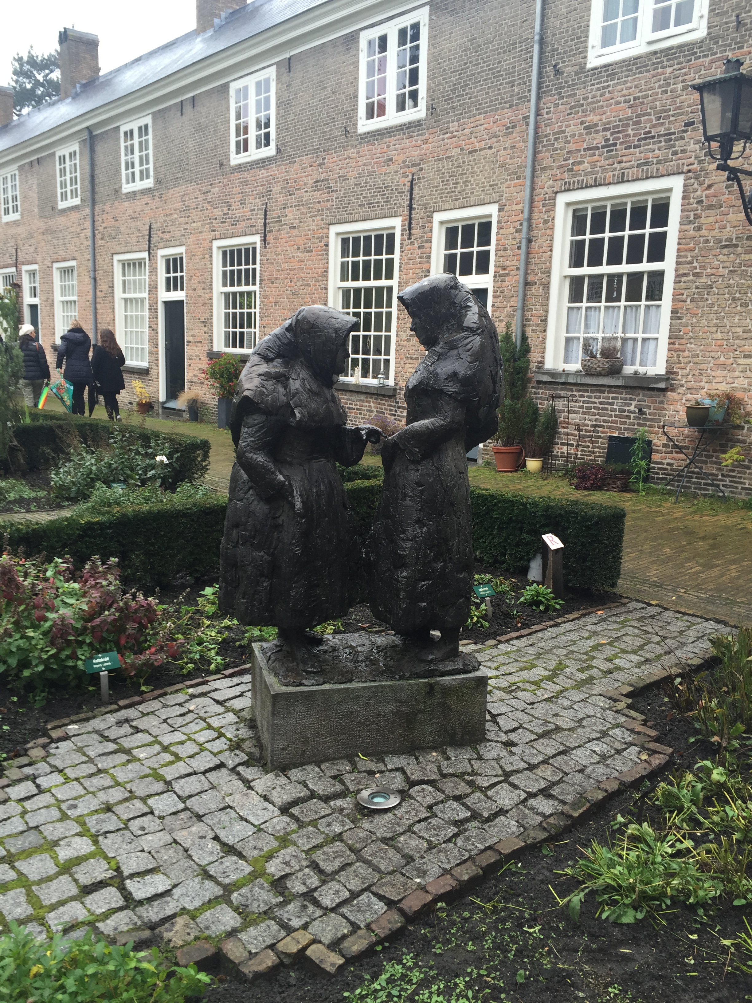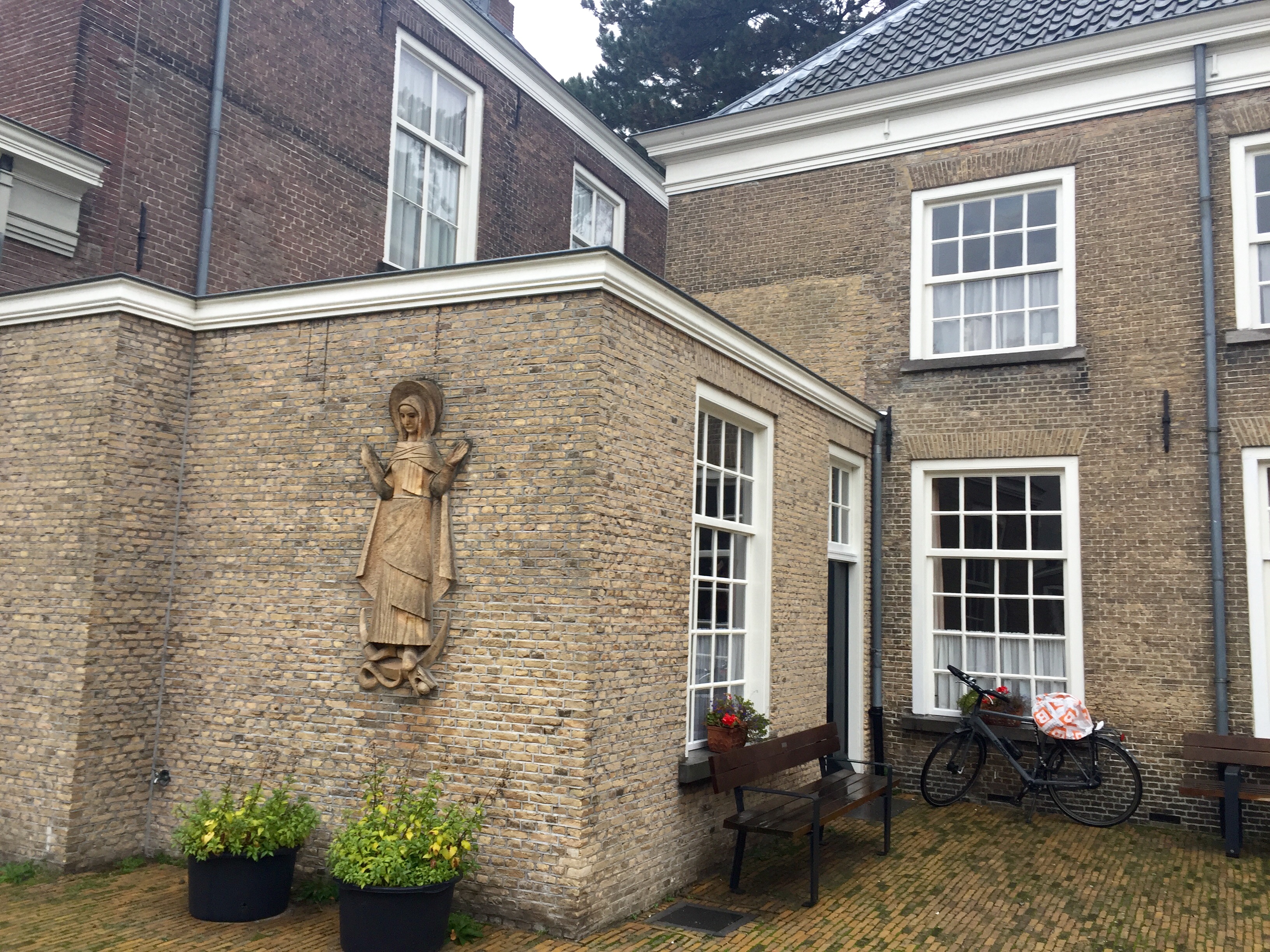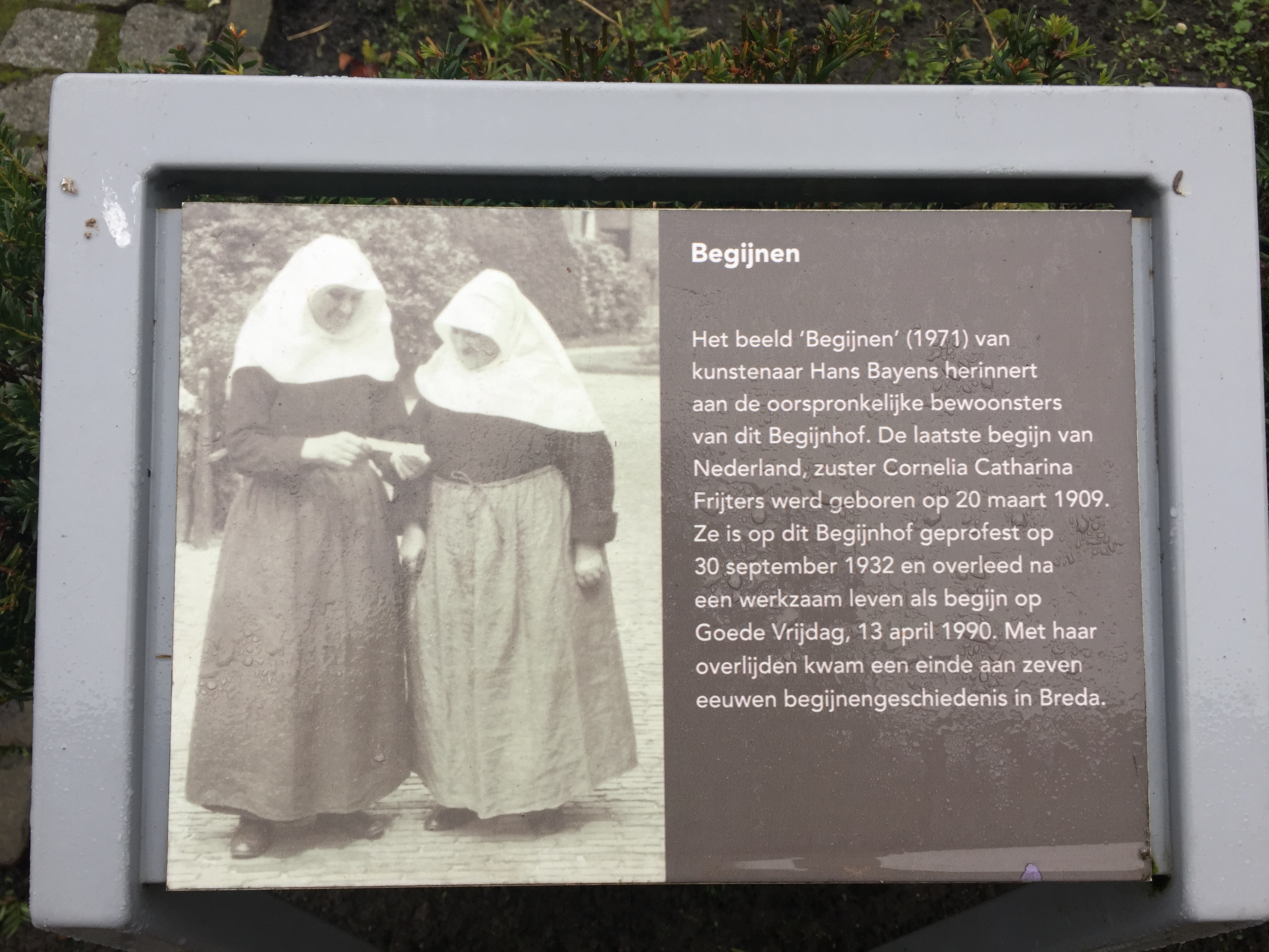 From the plaquard: The image “beguines” (1971) by artist Hans Bayens recalls the original inmates of the Beguine. The last Beguine of Netherlands, Sister Cornelia Catharina Frijters was born on March 20, 1909. She is the Beguine professed on September 30, 1932 and died after a working life as beguines on Good Friday, April 13th 1990. With her death came to an end Seven centuries of history in Breda Beguine.