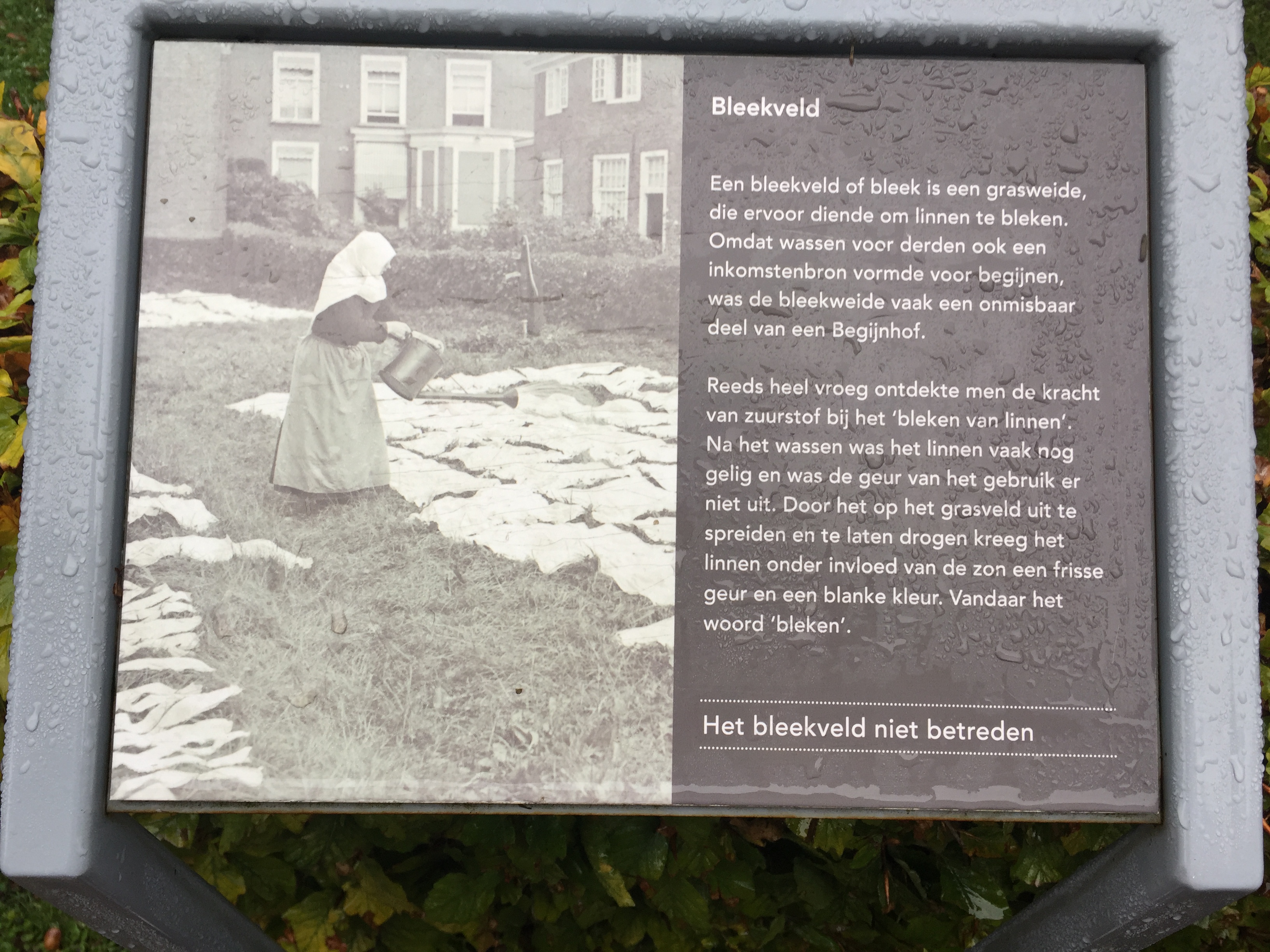 From the plaquard: A pale or pale field is a meadow, which was sure to bleach linen. Because wash for others was also a source of income for beguines, the pale meadow was often an essential part of a former convent. Very early it was discovered the power of oxygen for bleaching linen “After washing the linen was often yellowish and the smell of the use not get out. By spreading out on the lawn and let it dry linen was under the influence of the sun a fresh scent and a white color. Hence the word ‘bleaching’.