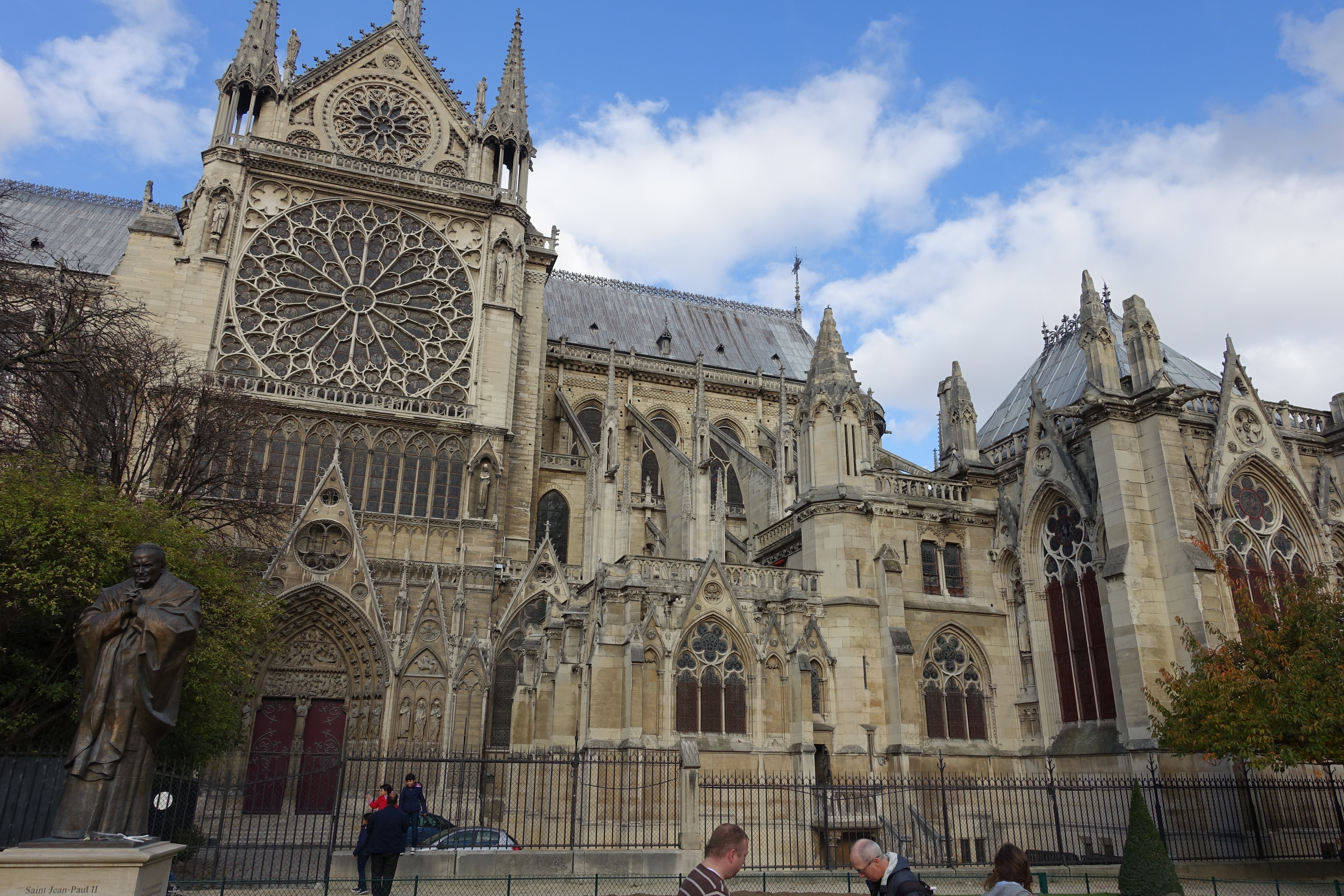 After walking around the streets for a bit, we were a bit tired and MyMan and I hung out on the benches in this park behind Notre Dame while the girls played. There is a small playground under the trees, and lots of benches on the other side.