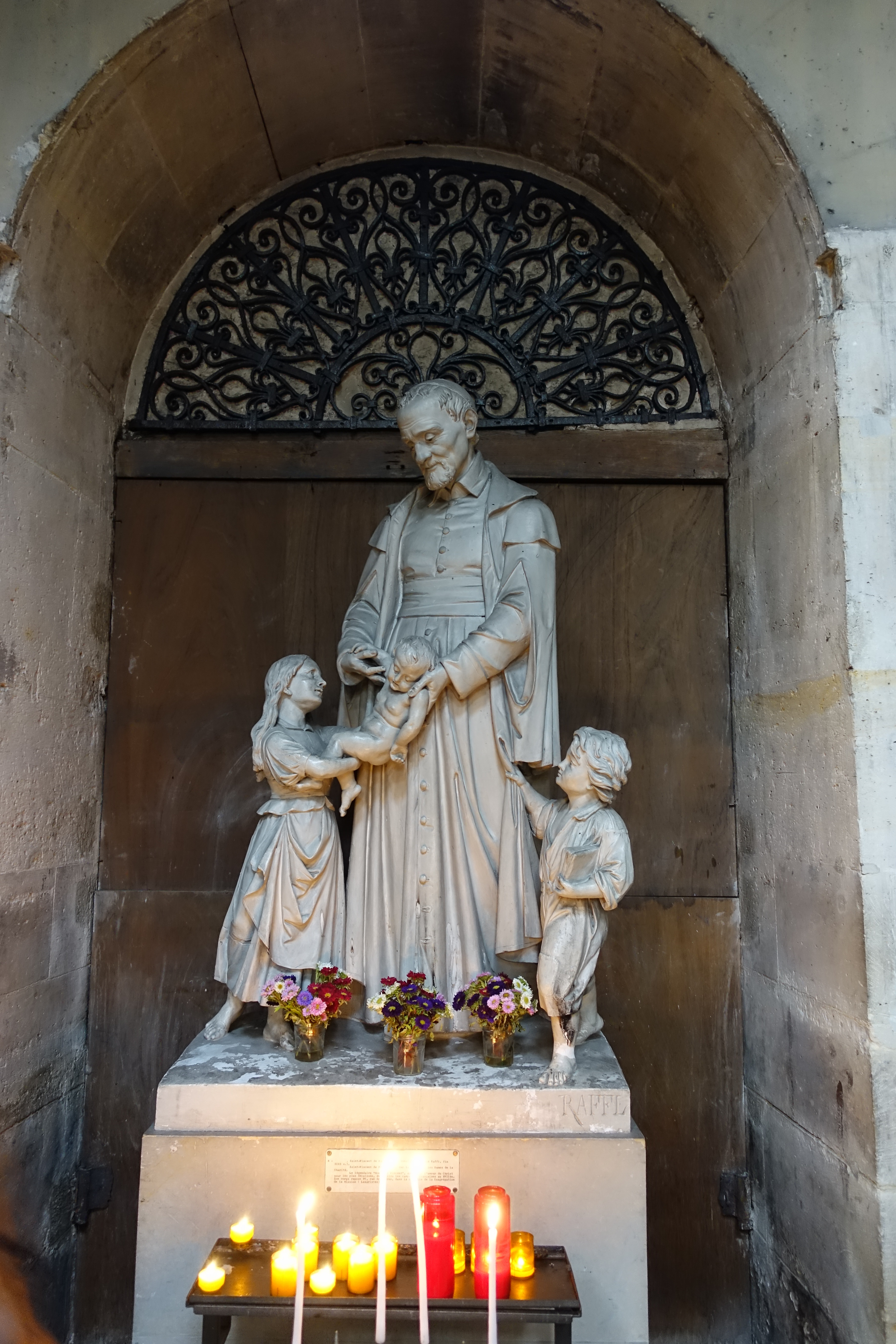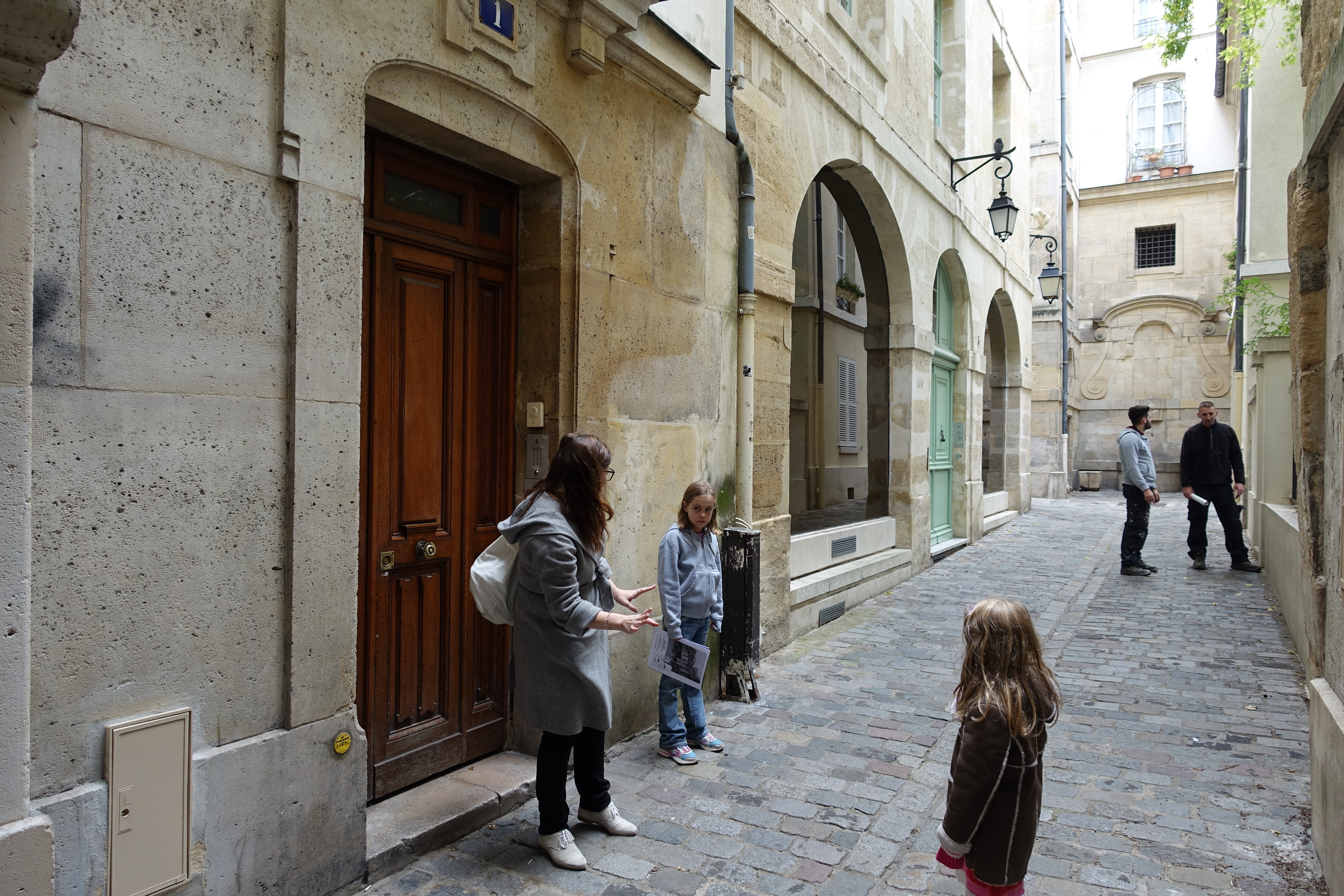 Here you see our guide Emily talking to the girls in this is an old street/passageway. Emily is telling the girls about why the old streets in Paris are slanted towards the middle and where the old adage “taking the high road” came from. If you don’t know…look at the middle of the street, and you notice the bricks are perpendicular to the others. People in their homes above would throw their chamber pots and raw sewage out of their windows, and it would land in the street. This was a “valley” or “trough” where sewage and waste would get washed down the street. As people walked down the street – you could tell people’s hierarchy based on where they stood in the street. The closer to the sewage, the lower in class you were. If you walked closer to the buildings, the higher up in class you were…thus taking the “high road”.