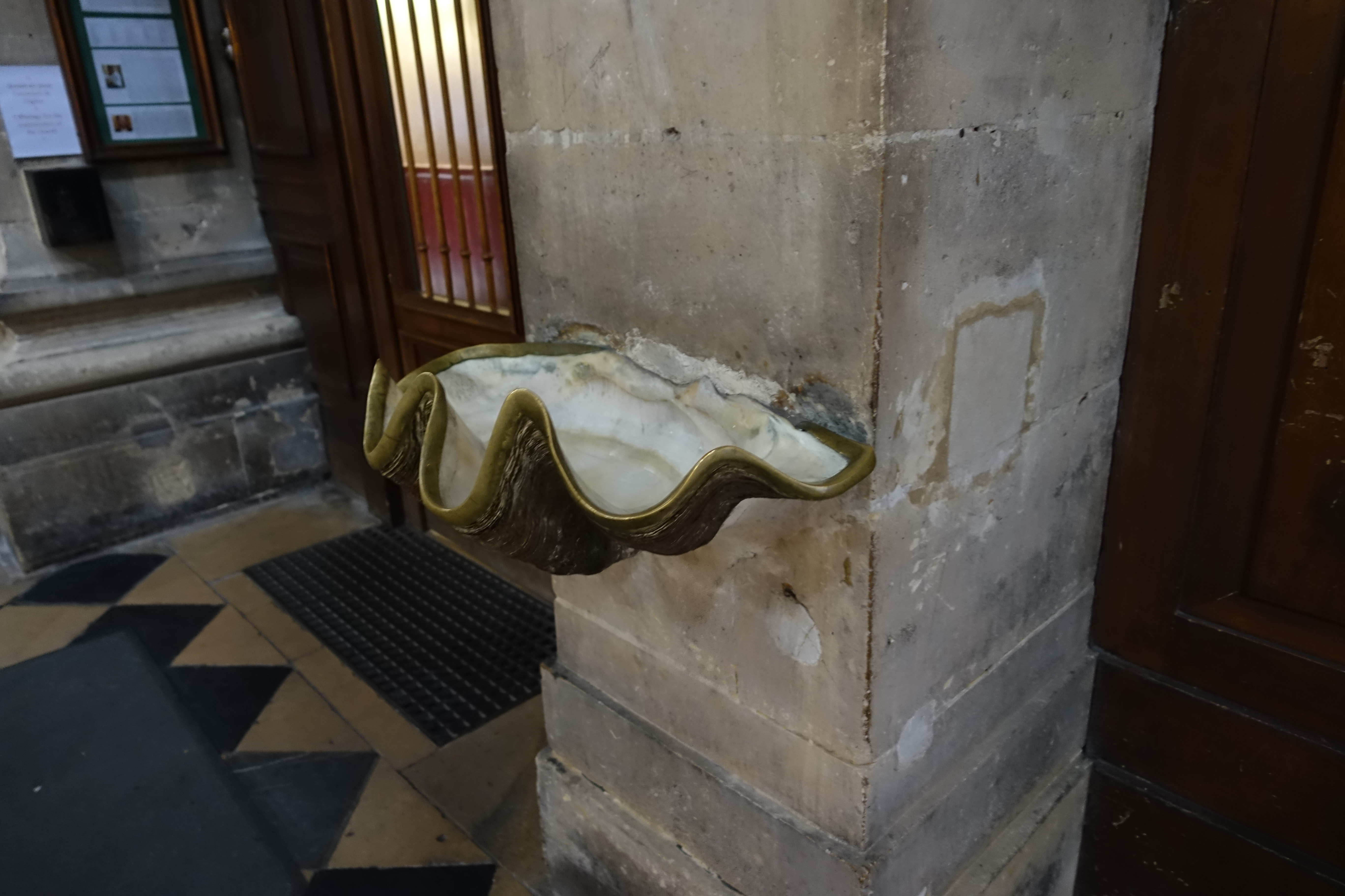 This is a HUGE (about 18-2-” wde!!) clam shell that was gifted to the church. It holds the Holy Water. There was another one (the other half of the shell) on the opposite side of the doorway. They were incredibly beautiful.