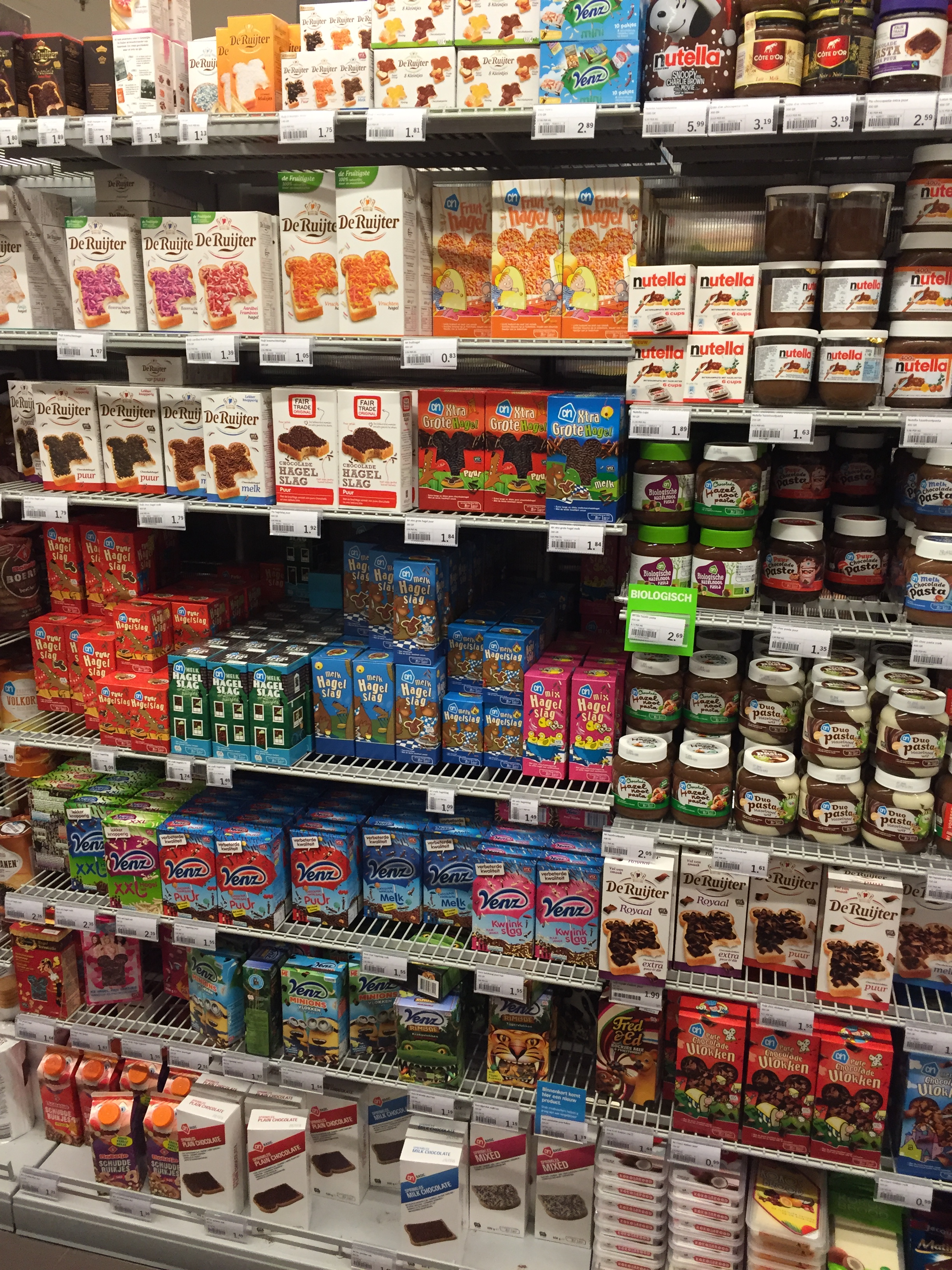 Yes….sprinkles. You know when you go to an ice cream shop, and your kid wants sprinkles (usually either chocolate or the multicolored kind) on their ice cream? Yep, that’s what I’m referring to. The Dutch LOVE their sprinkles, and eat it on bread. For lunch or a snack. Interesting. Here is their variety of sprinkles in my local Albert Hein.