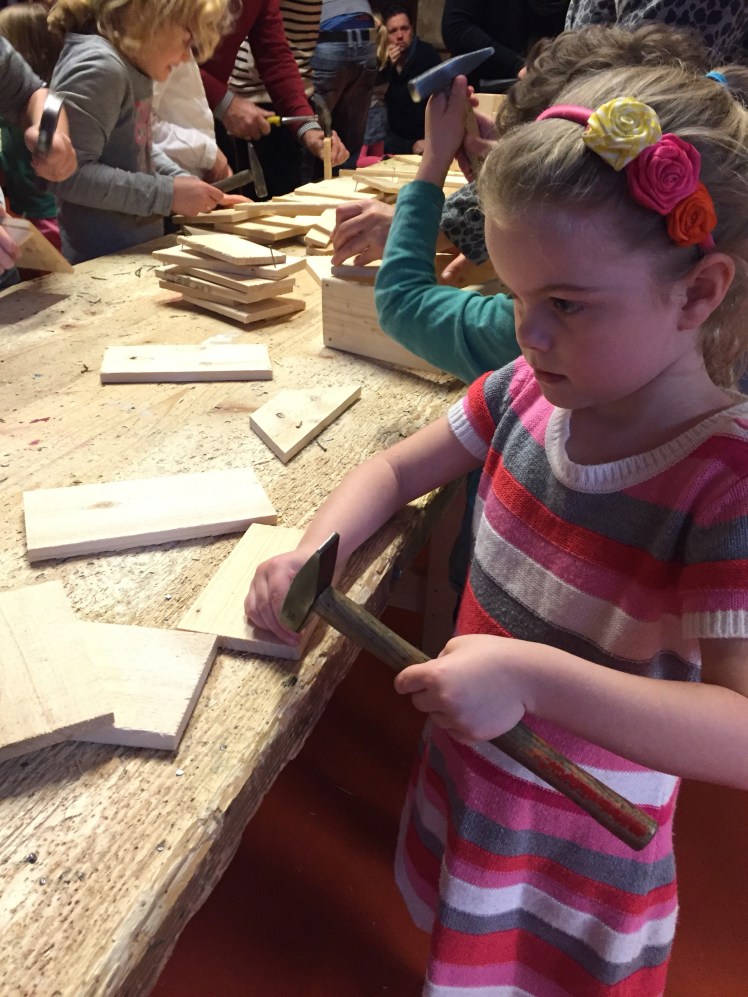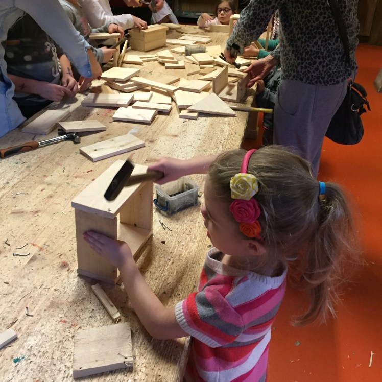 I was interested to note that while there were employees working, they did not have any stationed at any one particular place. Some kids were up in the upstairs part unsupervised. A few parents were there helping out the smaller ones. And the things I really noticed were….the kids got along and were polite to each other. They took turns waiting for tools they needed. The floor was surprisingly clean of wood pieces and nails! It was a really nice thing to witness.