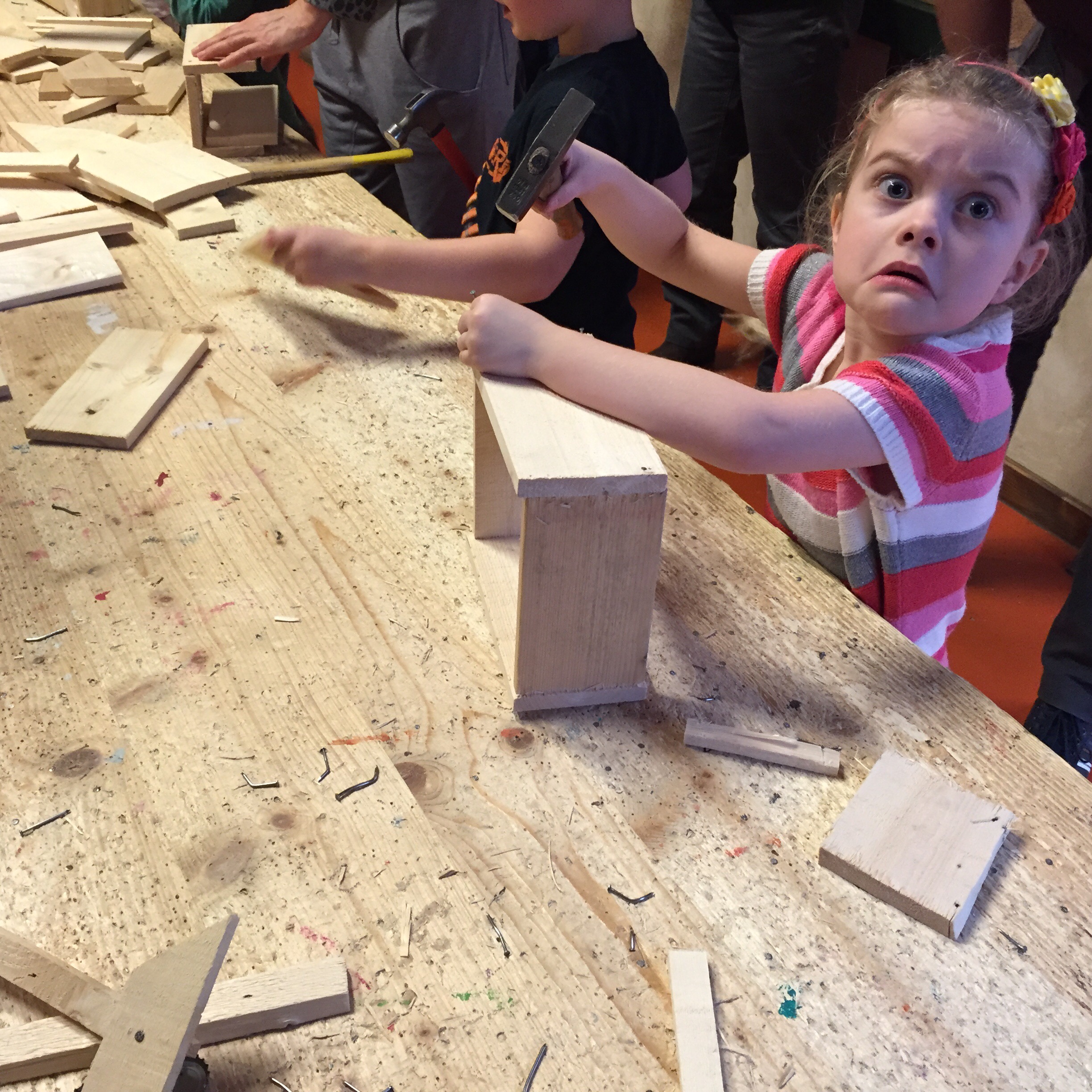 There was an upstairs area (I took the above pic from up there). Up here was the creative play space! They had an area where kids could take real wood and build a creation of their imagination with real nails and hammers!! Littlest loved this and wanted to build something. She ended up building a box. All I did was get the nails started.