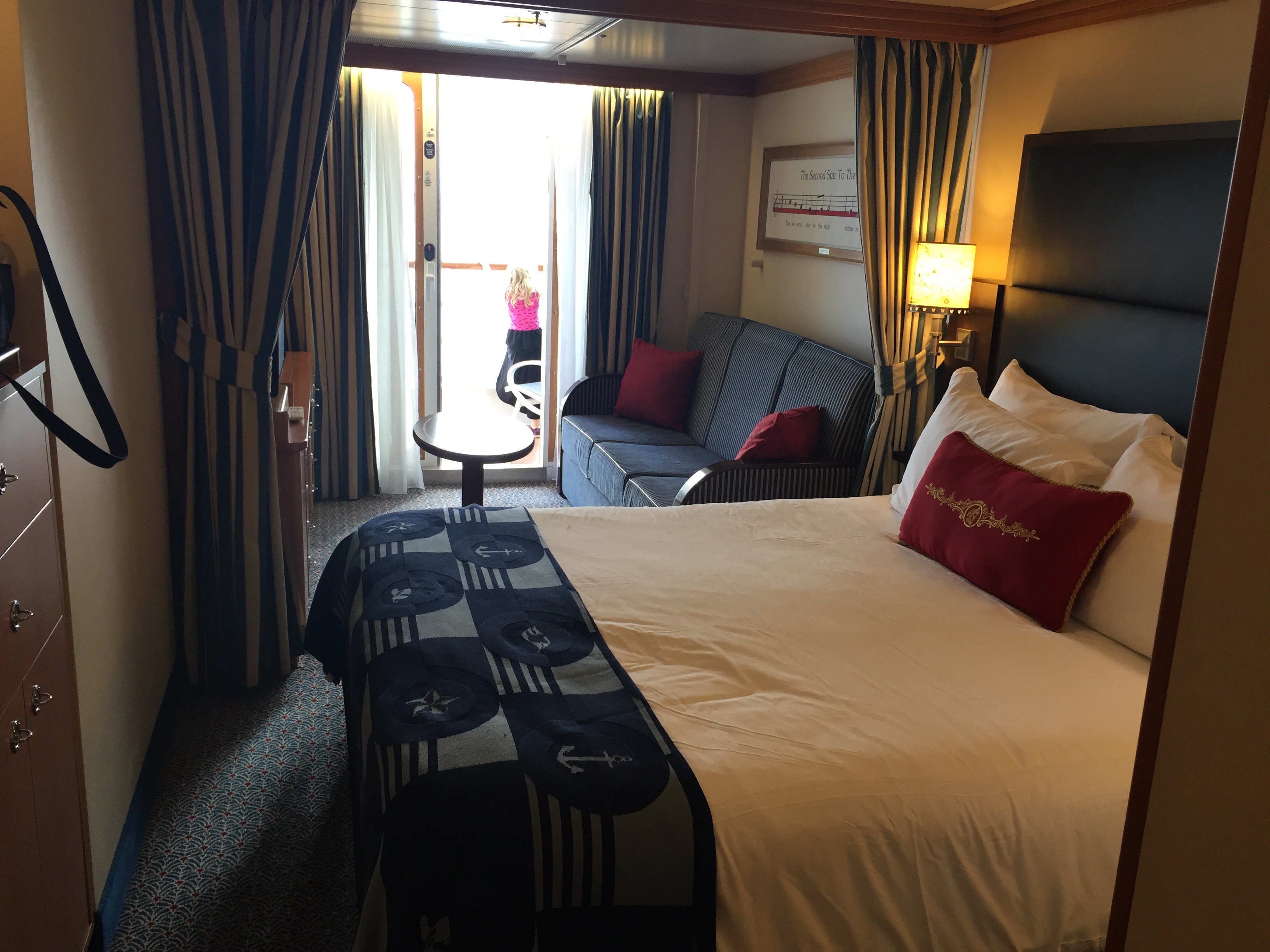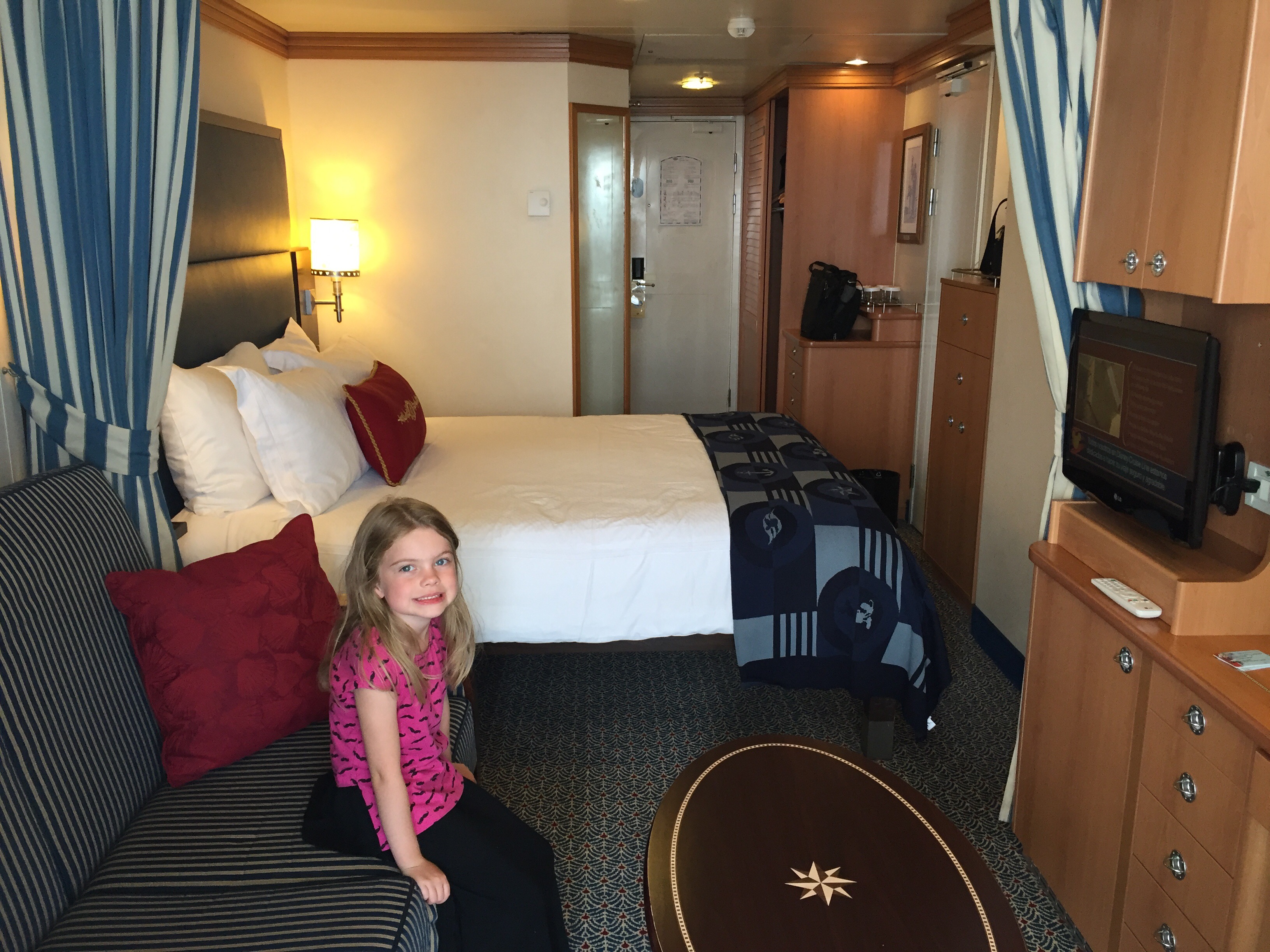 Whenever we have cruised in the past, we have always done a veranda stateroom because with small kids – you never know if they will get sick, or need a nap, or whatever, and having that extra space to be able to enjoy the outside while being tied to the room was invaluable to us. But when we first booked this cruise back in December, all the veranda staterooms were already booked! So we booked an inside stateroom just to get on board. When final payment day came – surprise, surprise – some veranda rooms opened up! So we snatched one up. And we enjoyed it a lot! It was quite cool/cold for much of the trip, so it was great to be able to get some fresh air. And being able to listen to the waves is also an awesome perk of a veranda room. But honestly, while we enjoyed the veranda, this will probably be the last time we will do a veranda stateroom room because the girls are older, we aren’t in the room that much anymore, and the ship had some great adult spaces where we could enjoy the outside.