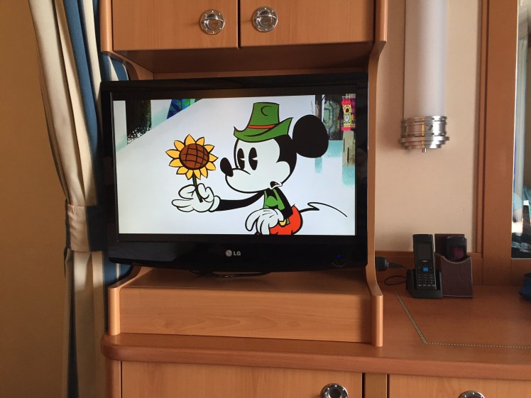 And of course you can find Mickey on the TV any time of the day, as well as various Disney movies, ship and excursion information, weather, and cruise destination info.