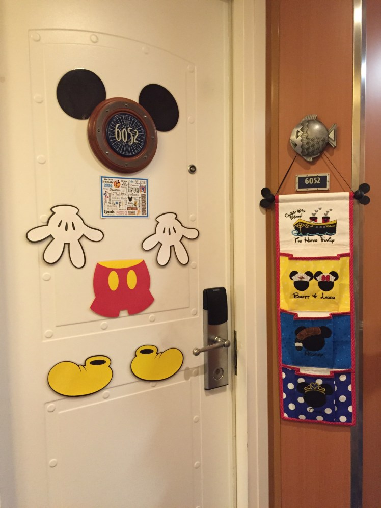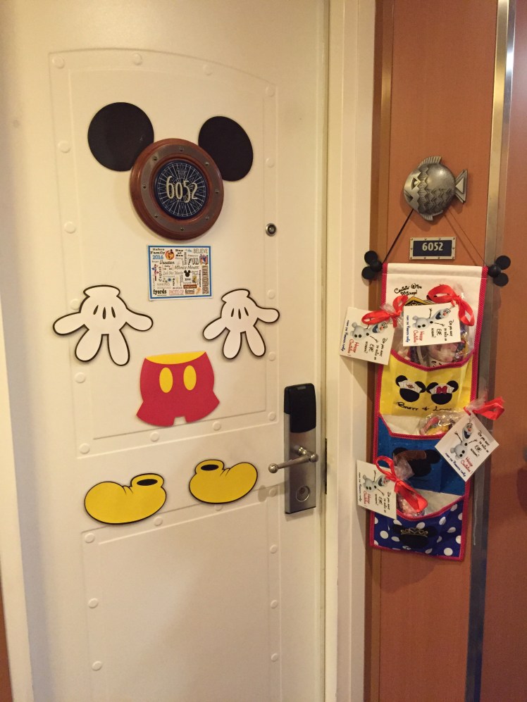 We participated in a Fish Extender gift exchange, which is something special for Disney Cruises (at least I’ve never heard of it on other cruises before). So to help us prepare for that, my friend Shanna send us along with some door magnets to help make our door more special! The extender hanging from the fish hook (hence the name Fish Extender!) is something I had made for the cruise from an Etsy shop. The game is you sign up to participate, and when you get all the names in your group (we had 12 cabins total), you make or buy small gifts for them that you bring on the cruise and put in their fish extenders throughout the cruise! You can do it for the cabin as a whole, or for individuals. It’s totally up to you! The square magnet under the stateroom is one of gifts that we received – it has all the ports of call, plus our name, etc on it! Love it!
