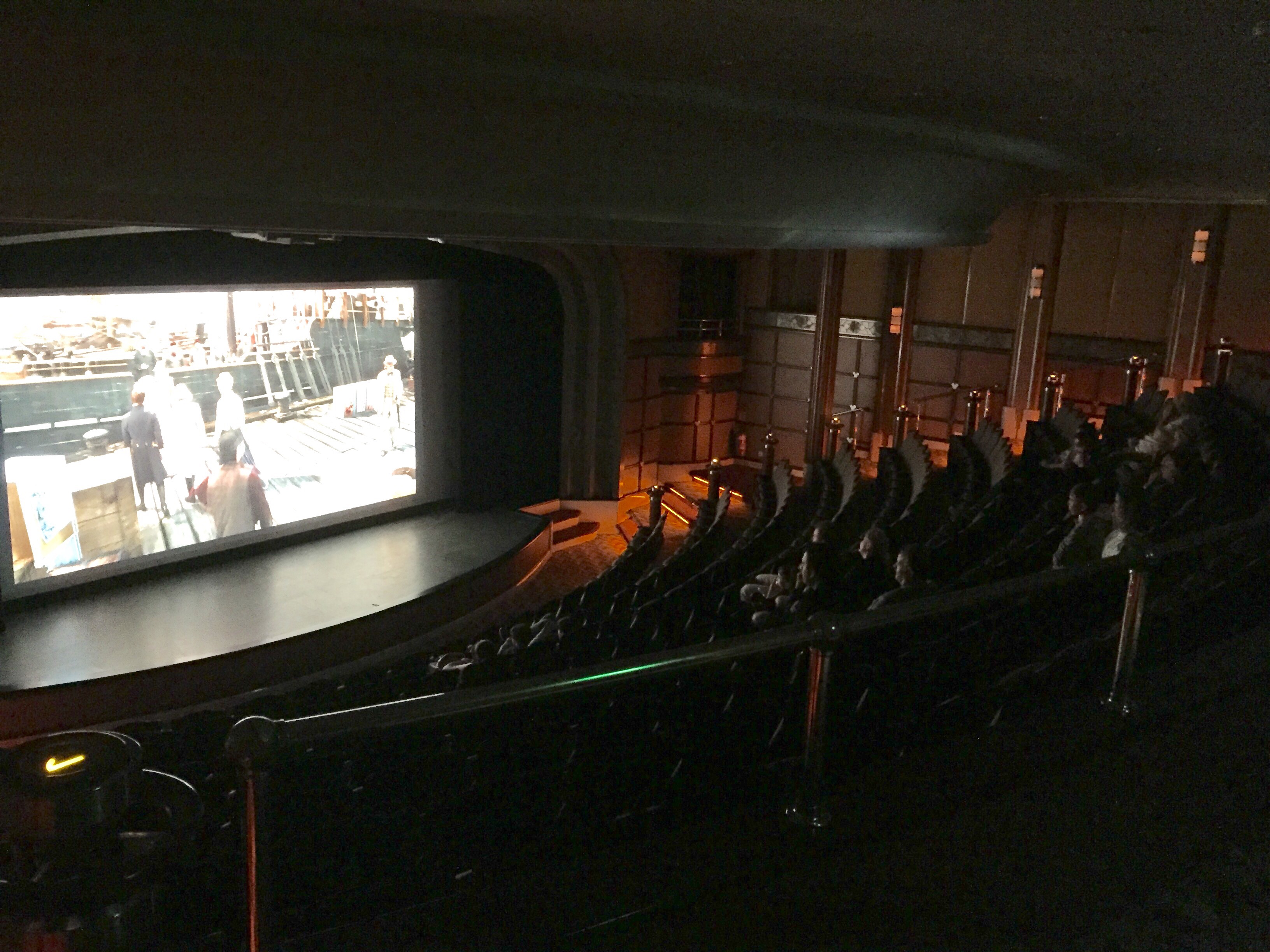 The other slide was a bit more daring! It is pictured below – the red and blue slide. The floor dropped out from beneath you, and it swings you out off the side of ship and back around, which you can see in the second photo. Oldest finally worked up the courage to try this slide on our last day! And there was always a movie playing on the big deck TV!